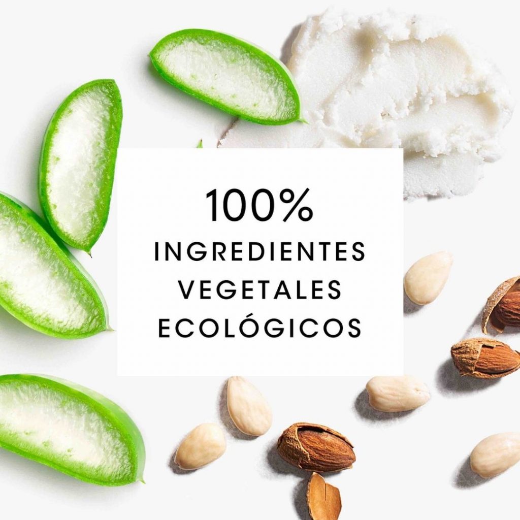 Aqua , * Aloe barbadensis leaf , Caprylic / Capric triglyceride , * Prunus amygdalus dulcis oil , Glyceryl stearate citrate , Glycerin , * Butyrospermum parkii butter , Parfum , Benzyl alcohol, Cetyl alcohol, Xanthan gum , Benzoic acid , Citric acid , Sorbic acid , Sodium phytate . * Ingredients procedents de l'agricultura ecològica. 99% de l'total és d'origen natural i el 21% de l'total dels ingredients procedeix de l'agricultura ecològica. 90% biodegradable. Envàs 100% reciclable. COSMOS ORGANIC Certificat per Ecocert Greenlife segons l'estàndard COSMOS.